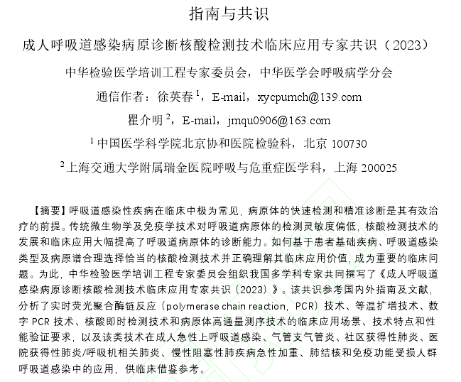 共識速遞|《成人呼吸道感染病原診斷核酸檢測技術臨床應用專家共識(2023)》發布