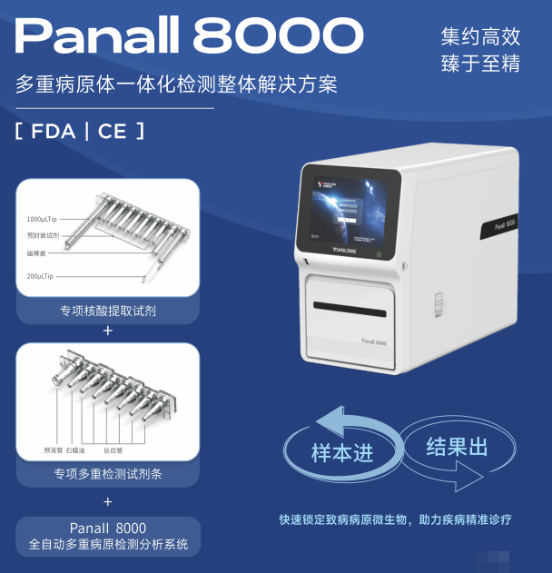 其中,天隆新近推出的呼吸道 17 項病原體核酸檢測試劑,配合天隆Panall 8000全自動多重病原檢測分析系統,樣本進-結果出,一次實現17項病原體核酸的自動化檢測。檢測病原體分別為甲型流感病毒、乙型流感病毒、呼吸道合胞病毒、人鼻/腸病毒、新冠病毒、肺炎支原體、肺炎衣原體、腺病毒、副流感病毒 (1//TT/V型)、冠狀(0C43/HKU1)、人偏病 (L/T型)、冠狀病毒(NL63/229E)、人偏肺(I/I型)、甲型流感病毒(H1/H3/09H1)和博卡病毒。其中,鼻/腸病毒、甲型流感病毒(H3)及甲型流感病毒(H1/09H1)的最低檢出限為 500copies/mL,其他病原體的最低檢出限為 200copies/mL