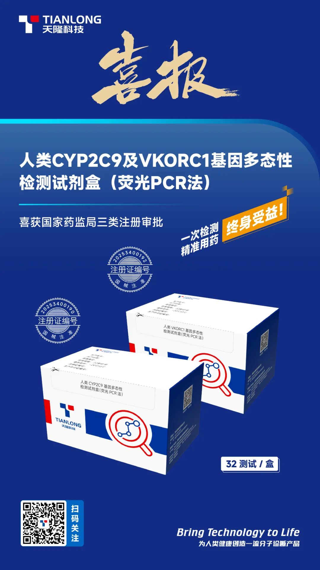 天隆科技自主研發(fā)的人類CYP2C9及VKORC1基因多態(tài)性檢測試劑盒(熒光PCR法)通過國家藥監(jiān)局注冊審批,獲得三類醫(yī)療器械注冊證,天隆藥物基因家族再添新成員。