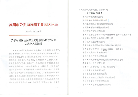 近日,蘇州市公安局蘇州工業(yè)園區(qū)分局關(guān)于園區(qū)治安保衛(wèi)先進(jìn)集體和治安保衛(wèi)先進(jìn)個人評選的結(jié)果出爐,蘇州天隆生物科技有限科技公司(以下簡稱“蘇州天隆”)憑借在安全管理中的突出表現(xiàn),榮獲“園區(qū)治安保衛(wèi)先進(jìn)集體”榮譽(yù)。同時獲得該榮譽(yù)的還有蘇州華為、中科院蘇州納米所、企查查等單位。這一榮譽(yù)不僅是對公司長期以來安全管理工作的認(rèn)可,更彰顯了企業(yè)在履行社會責(zé)任、保障區(qū)域安全穩(wěn)定中發(fā)揮的積極示范作用。