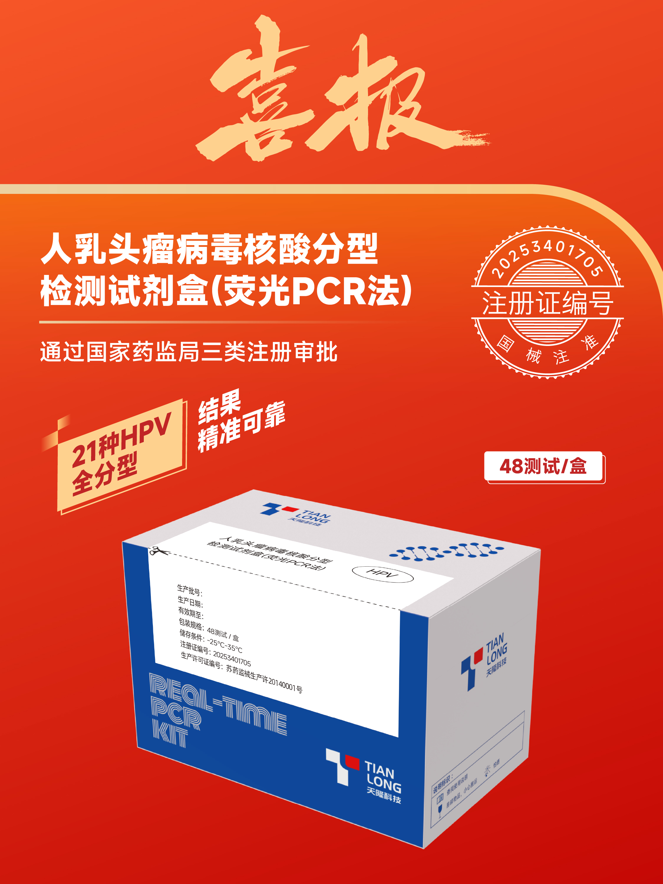 天隆HPV核酸分型檢測試劑,采用熒光PCR技術(shù),一次可實現(xiàn)21種HPV的核酸分型檢測(HPV16, 18, 26, 31, 33, 35, 39, 45, 51, 52, 53, 56, 58, 59, 66, 68, 73, 82及HPV 6, 11和81型)。
