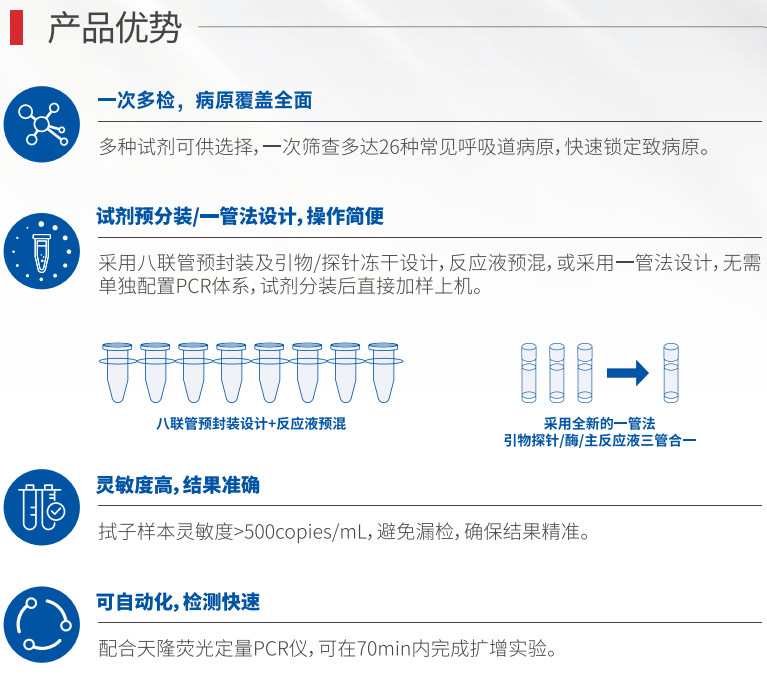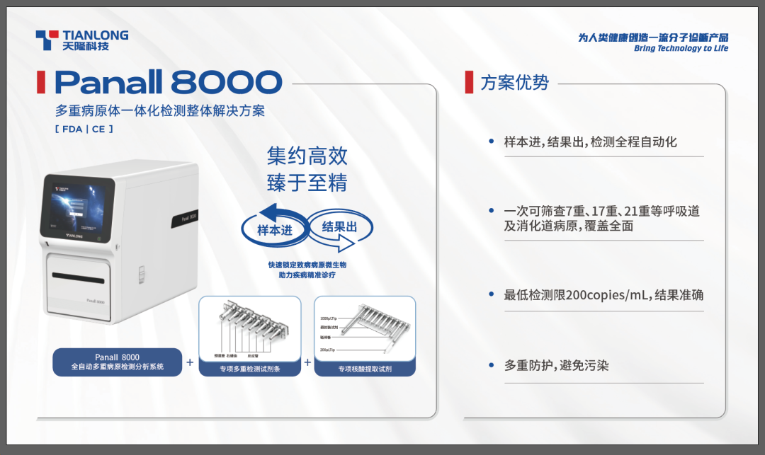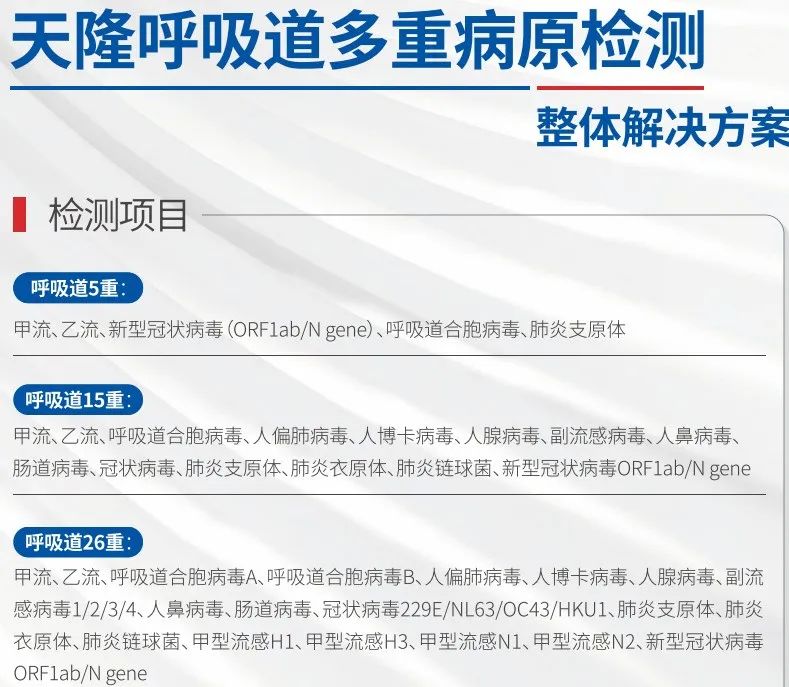 天隆多重呼吸道感染分子診斷方案,覆蓋流感、肺炎支原體、新冠、呼吸道合胞、鼻病毒、腺病毒等近百種檢測項目,方案包含系列設備及配套試劑,并有核酸檢測一體機及傳統提取+熒光PCR平臺可選,助力早期診斷和及時鑒別,為您的健康保駕護航。